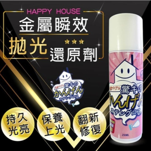 產品名稱:: HAPPY HOUSE金屬瞬效拋光還原劑 容量:250ml 台灣潮濕環境容易造成車身或家庭金屬配件氧化生鏽, 搶救您氧化的鍍鉻金屬配件,還你光滑晶亮的外觀。 清潔去污,形成保護膜;去污除鏽一瓶搞定。 1. 適用各種金屬材質,包括鋁、不鏽鋼、電鍍、銅等表面,亦適用車身電鍍部分,包括電鍍保險桿、車門把手、邊飾、後照鏡等,也適用家中電鍍材質的水龍頭、蓮蓬頭、陽台欄杆、鐵門門把等。 2. 具有清潔去汙、除鏽功能。並且形成光亮保護膜,減少生鏽的機會。 3. 可恢復大部分表面光澤度,並減少水滴、灰塵等汙染附著。 4. 使用前請先以小範圍做測試,若不適合請立刻停止使用。 5. 本產品只真對金屬表面作光亮研磨之處理,無法針對原本、嚴重風化、鏽蝕之物件作環原修復。 全成分:界面活性劑、溶劑、矽氧烷、研磨劑 適用對象:適用生活中需除鏽、還原美化之鍍鉻配件。 使用方法: 1. 將預還原之表面擦拭乾淨,搖晃產品約15秒後均勻噴灑於表面上。 2. 可搭配牙刷、乾抹布或海綿來回擦拭,直到黑色殘餘物產生。 3. 等待稍微乾燥後用乾抹布擦拭乾淨即可。 注意事項: 1. 請勿吸入飲用,不甚飲入勿強吐並請盡速就醫。 2. 皮膚過敏者請帶手套作業;不甚濺入眼睛,請用清水沖洗眼睛15分鐘,若有不適請就醫。濺到臉或皮膚時請用肥皂洗乾淨。 3. 請遠離火源及氧化劑。 4. 請保管在陰暗處無日光照射環境下,40度C以下及孩童無法取得處 5. 使用前請詳閱操作步驟及注意事項。