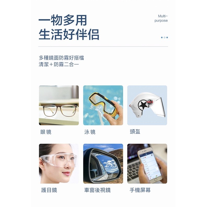 用途:用於各式眼鏡,鏡頭防霧