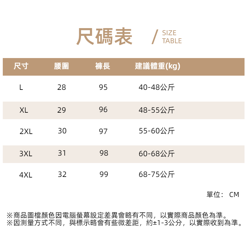 商品尺寸:L / XL / 2XL / 3XL / 4XL