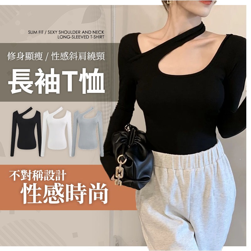 性感修身顯瘦 繞頸斜肩長袖T恤