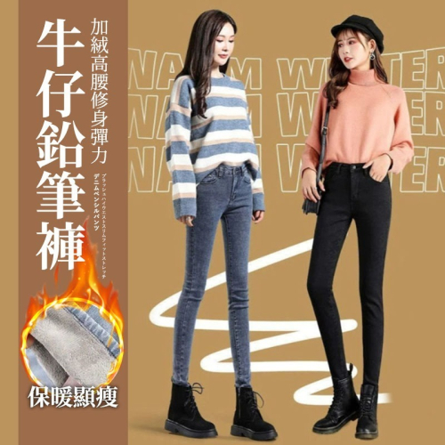 加絨高腰修身彈力牛仔鉛筆褲 加絨牛仔九分褲 加絨牛仔褲