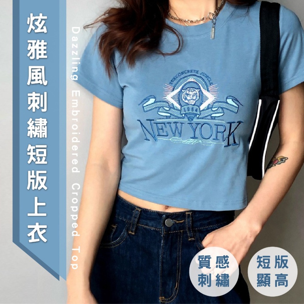 夏季新品潮流網紅藍色老虎圖刺繡 短版上衣 學生短版上衣 老虎圖刺繡上衣