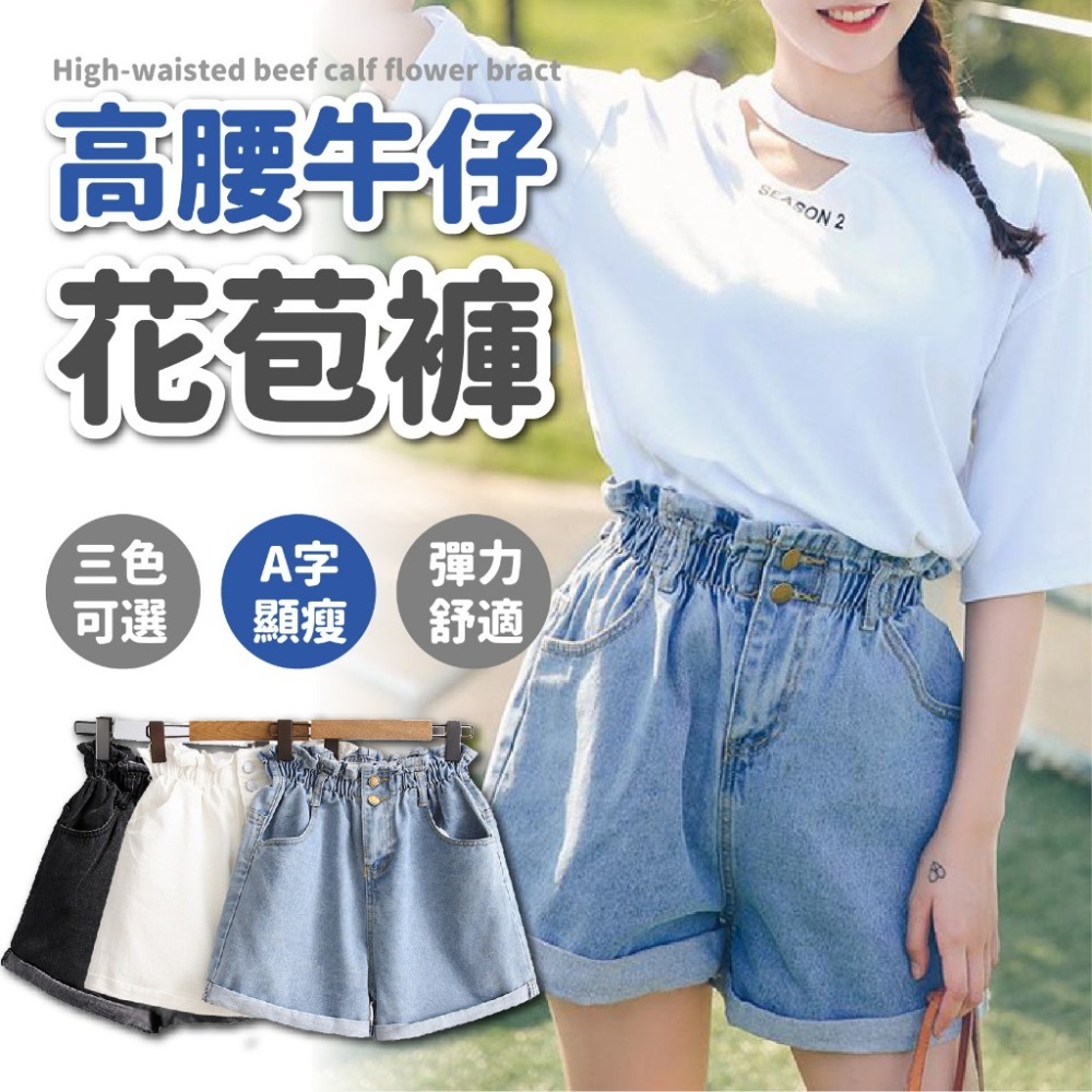 韓系高腰牛仔顯瘦寬鬆闊腿鬆緊a字短褲花苞褲 牛仔短褲 鬆緊牛仔短褲