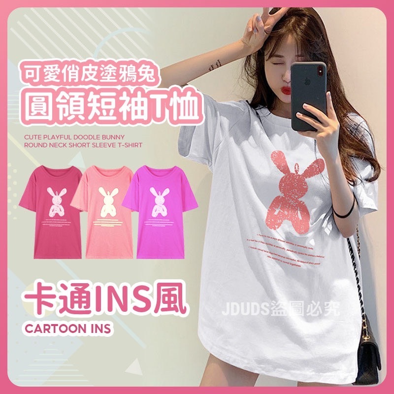 可愛俏皮塗鴉兔圓領短袖T-恤 寬鬆打底衫 閨蜜裝