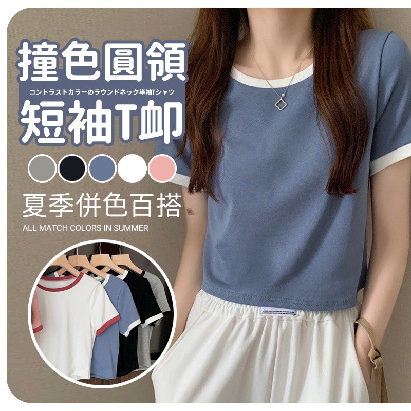 拚色圓領短袖T恤 修身短版T恤 學生風格 雙色圓領T恤
