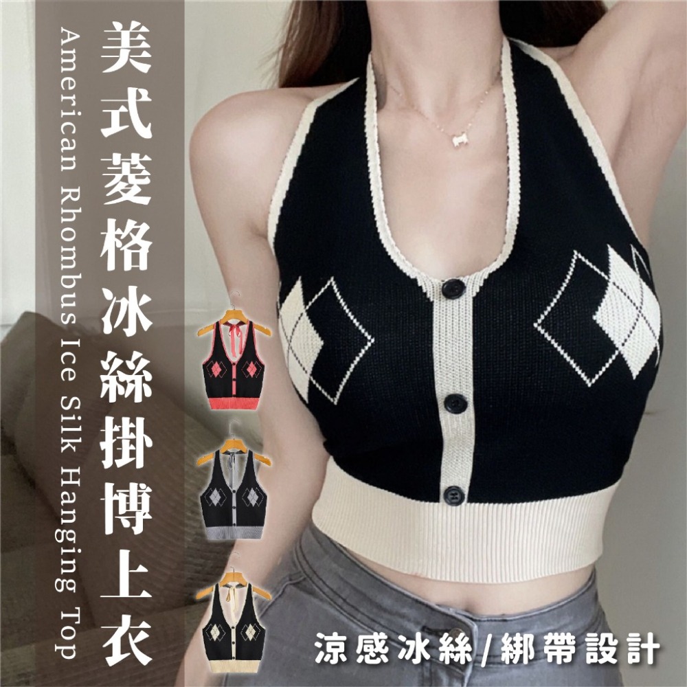 美式露背提花菱格背心 甜辣純欲風 吊帶背心 冰絲上衣 短款背心 掛脖針織背心 美背針織短款外穿上衣