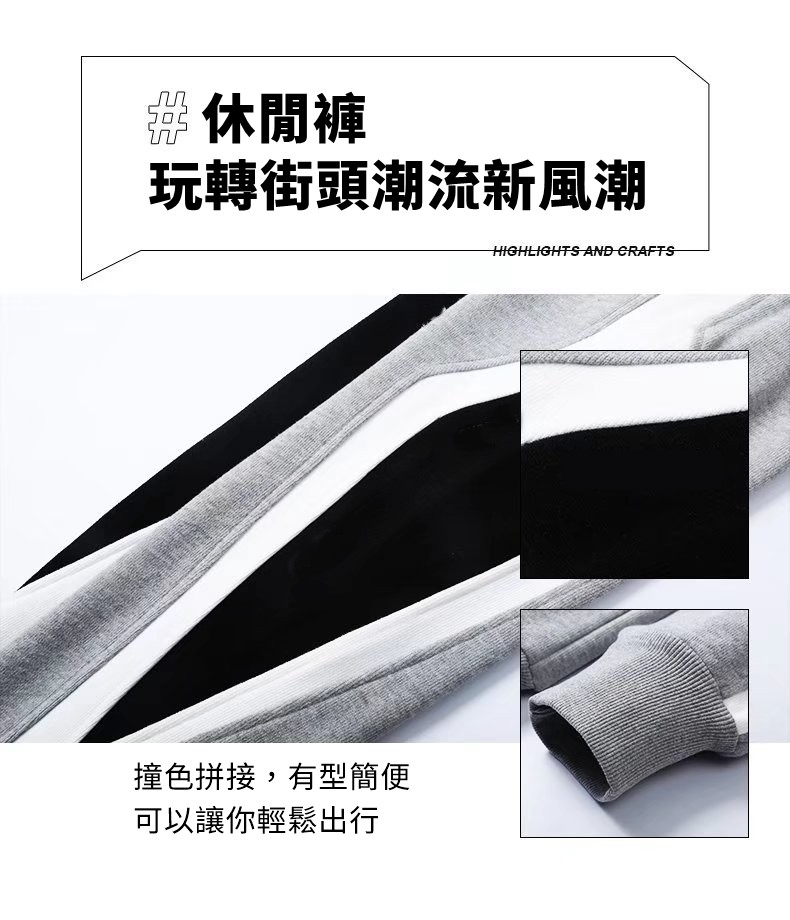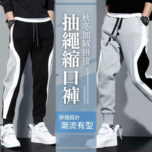 男秋冬加絨拼接運動抽繩縮口褲 保暖衛褲 寬鬆運動褲 縮口運動褲 束口褲 潮流休閒褲