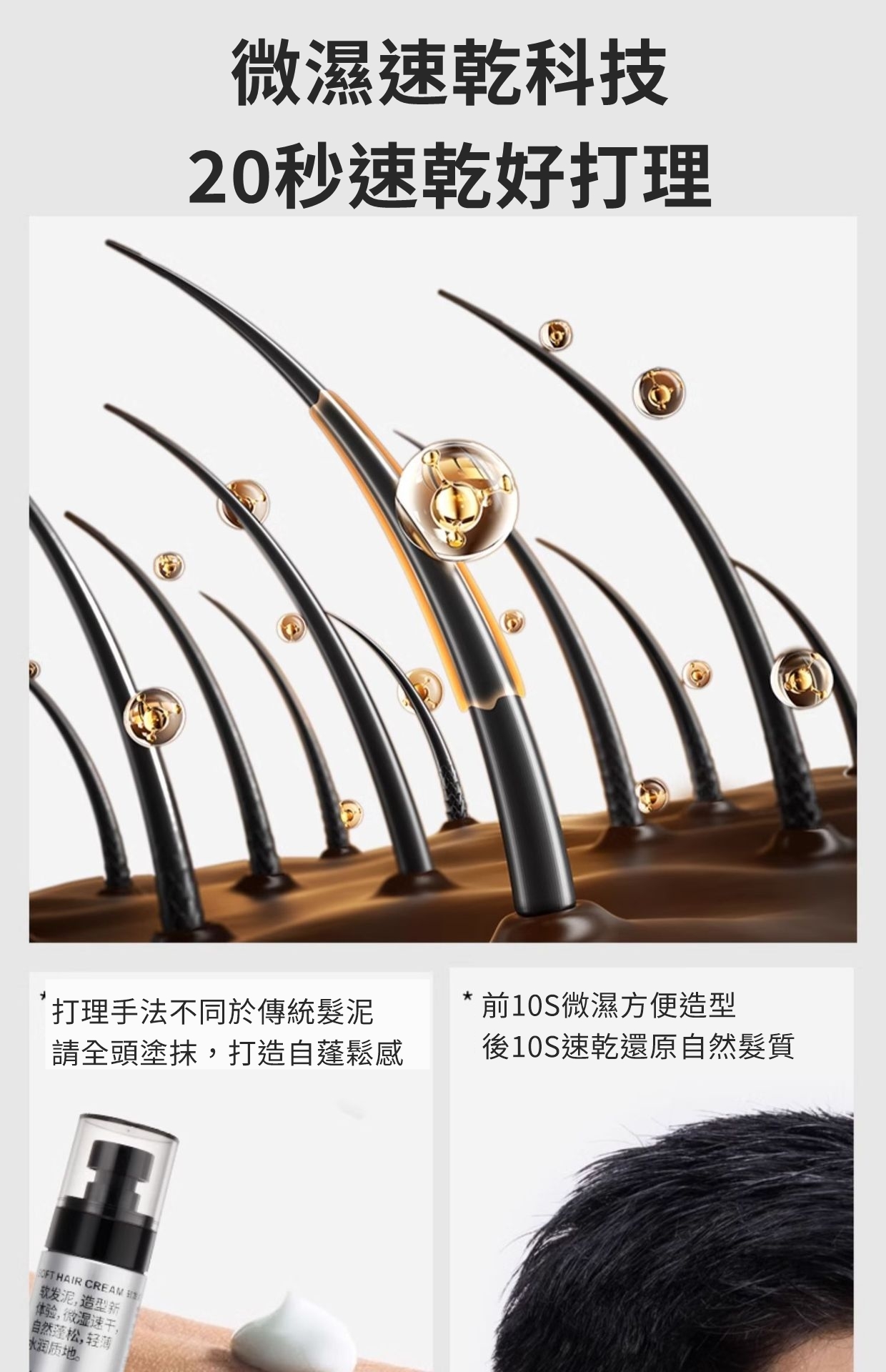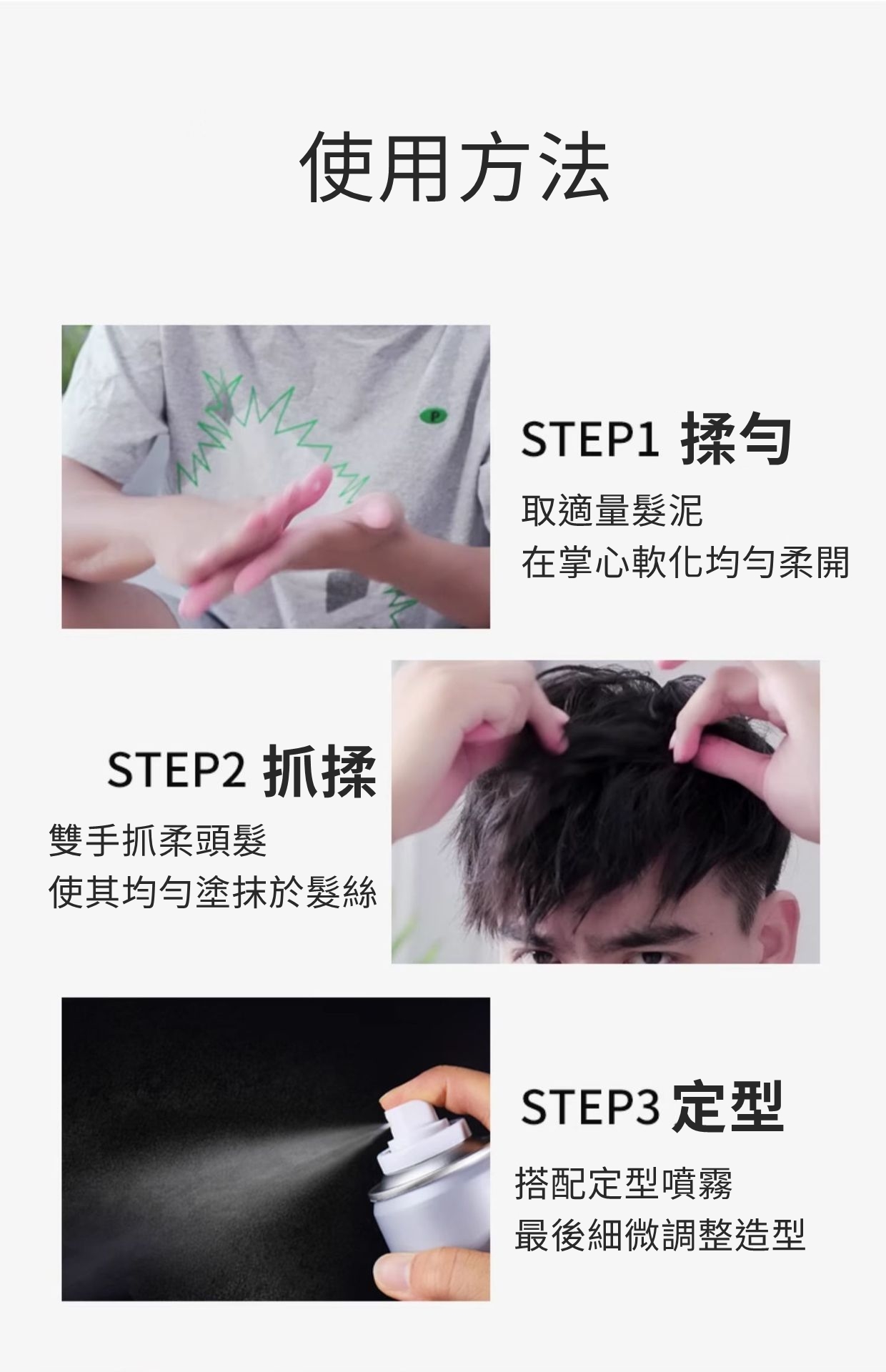 使用方法:取適量本品於掌心抹開,均勻塗於想要造型的頭髮上,用手指和梳子打理出理髮型。