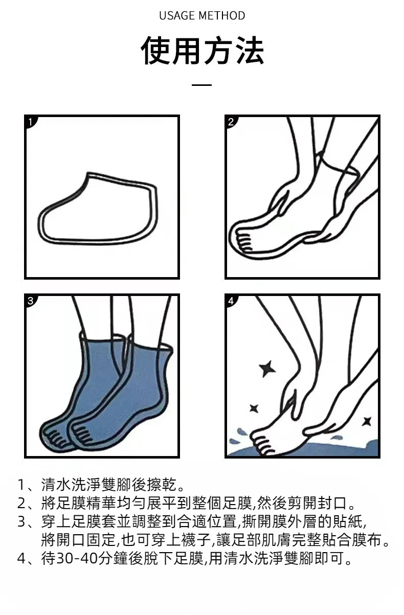 4、待30-40分鐘後脫下足膜,用清水洗淨雙腳即可。