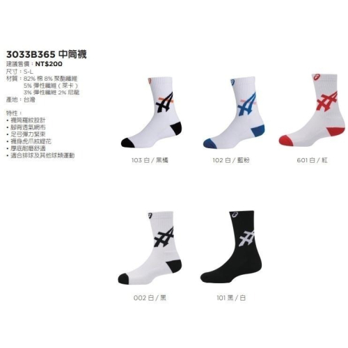 ⚽️乒冠體育🏓 ASICS 3033B365 中筒襪 3033B365-601 紅標 3033B365-002 黑標 3033B365-101 白標黑底 建議售價:NT$200 尺寸:S-L 材質: 82% 棉 8% 聚酯纖維 5% 彈性纖維 ( 萊卡 ) 3% 彈性纖維 2% 尼龍 產地:台灣 特性: • 襪筒羅紋設計 • 腳背透氣網布 • 足弓彈力緊束 • 襪身虎爪紋緹花 • 厚底耐磨舒適 • 適合排球及其他球類運動 #乒冠體育用品社 #選擇乒冠助您拼冠 #庫存隨實體銷售變動,下單前聊聊確認 下單前請注意下文: 因蝦皮賣場無提供產品退換貨服務,本賣場除商品瑕疵外,下單前請注意以下幾點,皆不予退換貨: 1.尺碼不合,衣 褲 鞋等穿戴衣著類商品,請確認好您的尺碼,若購買後尺碼不符,不予退換貨。 2.商品色差,因目錄照片或上傳之實物照相,與您接收到之商品所產生的色差不同,不予退換貨。 3.標牌丟棄,商品拆標牌並已丟棄後發現瑕疵,不予退換貨。 為保障您我之雙方權益,請購買前確認以上事項喲!感謝並祝您購物愉快。