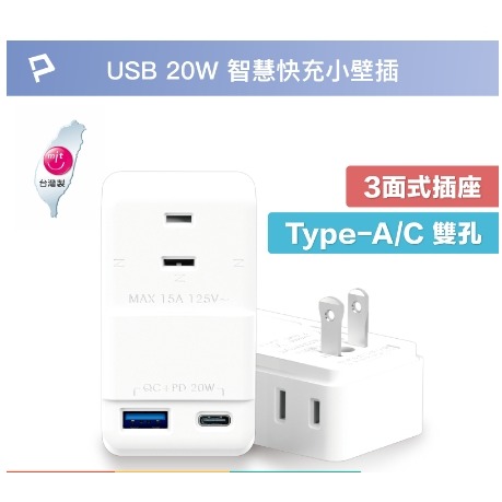 ◎ 產品: Polywell USB+Type-C 20W快充電源1轉3壁插