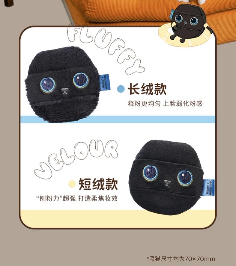 黑貓絨絨:長絨+短絨,材質為水晶絨、長絨,尺寸為7*7CM。