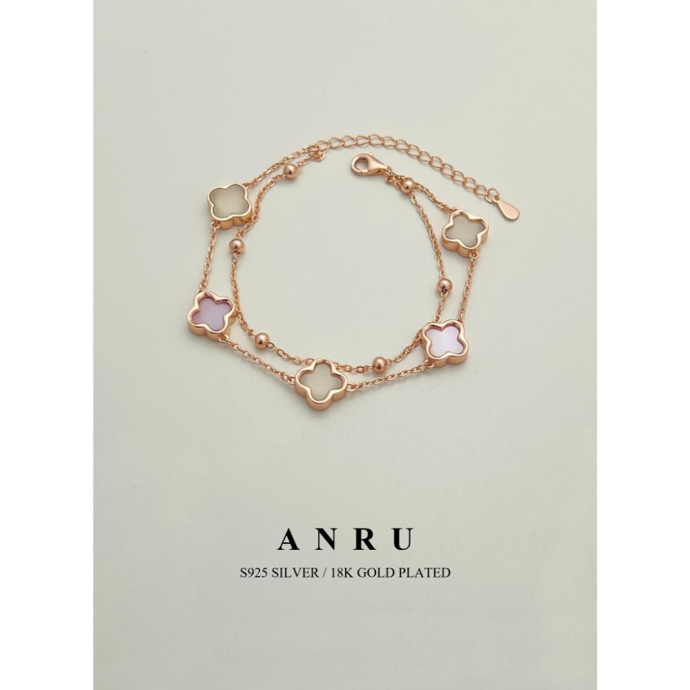 |ANRU 幸運四葉草|純銀和田玉白貝手鍊|S925 18K金色 天然珍珠 手鍊 手環 輕奢 x 優雅 x 幸運