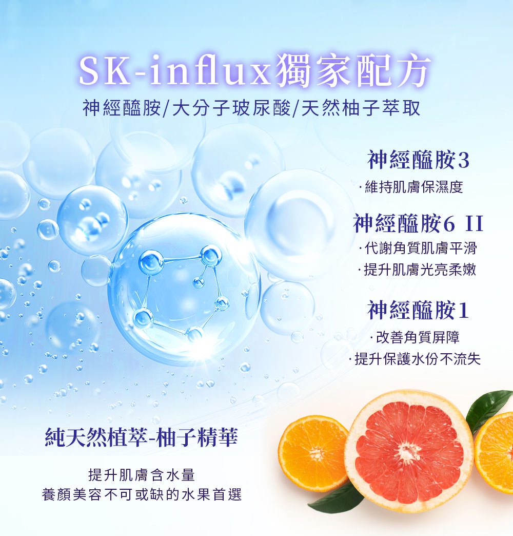 主成分:純水、玉米醇、泛醇(維他命B5)、玻尿酸鈉、柚子萃取、神經醯胺 3、神經醯胺6 II、神經醯胺 1