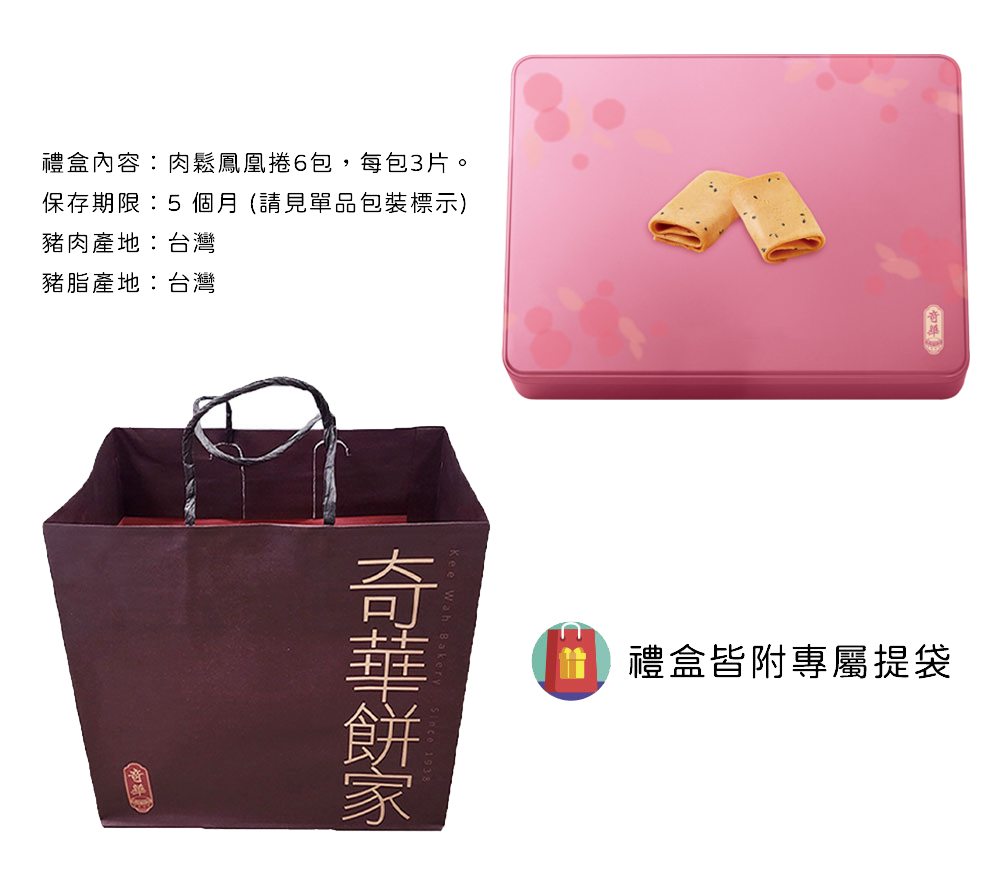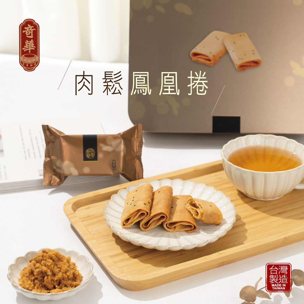 為奇華特有製程,嚴選新鮮雞蛋及上等麵粉,由傳統蛋卷演變而成,外層色澤金黃,包覆特級肉鬆,香氣四溢,蛋香濃郁,口感獨特難忘。