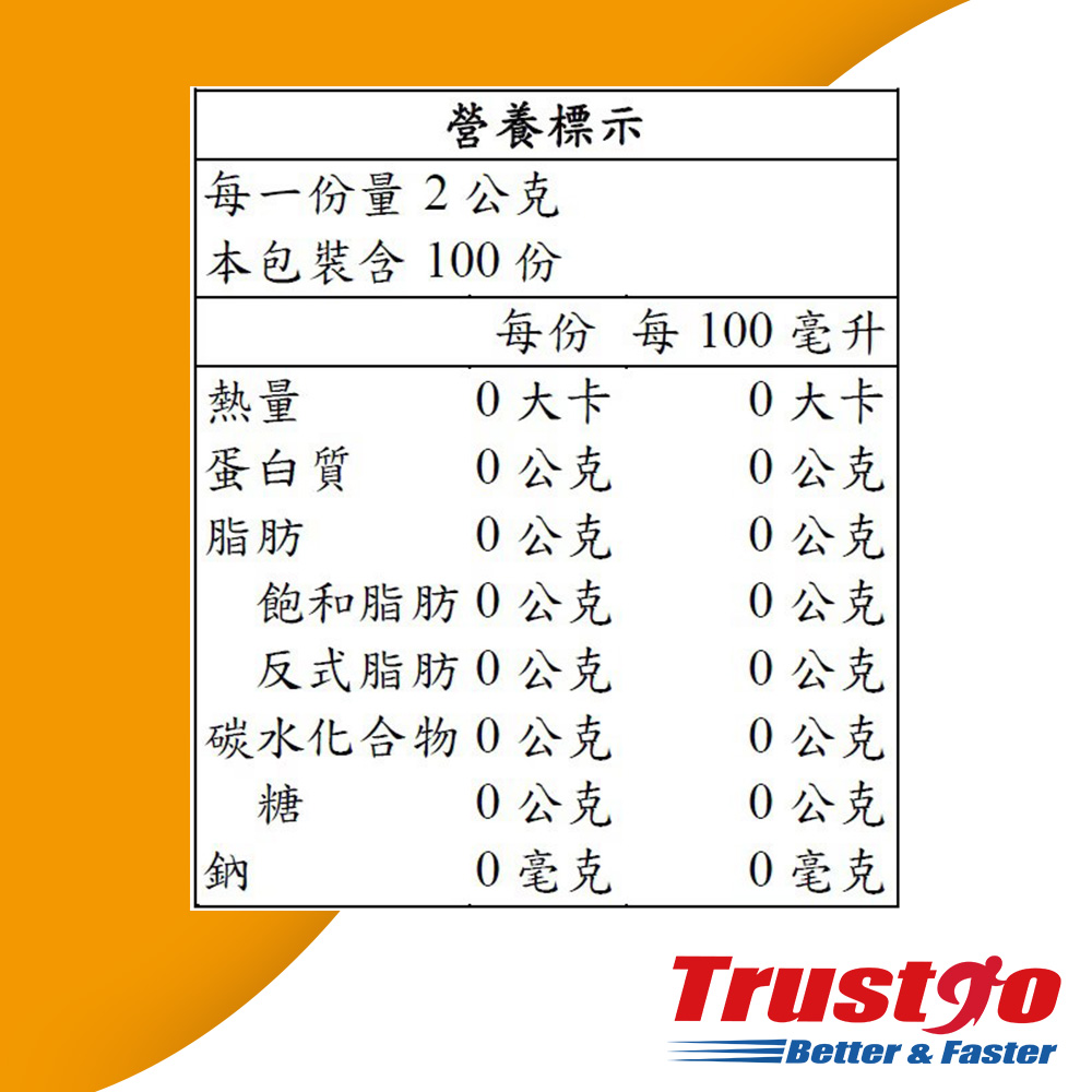 5.食品添加物名稱:營養標示 每份2公克,本包裝含25份 熱量---------------------0 大卡 蛋白質------------------0 公克 脂肪---------------------0 公克 飽和脂肪------------0 公克 反式脂肪------------0 公克 碳水化合物------------0 公克 鈉------------------------0 毫克 營養標示數據若與包裝上略有差異時,以實際包裝上標示為準