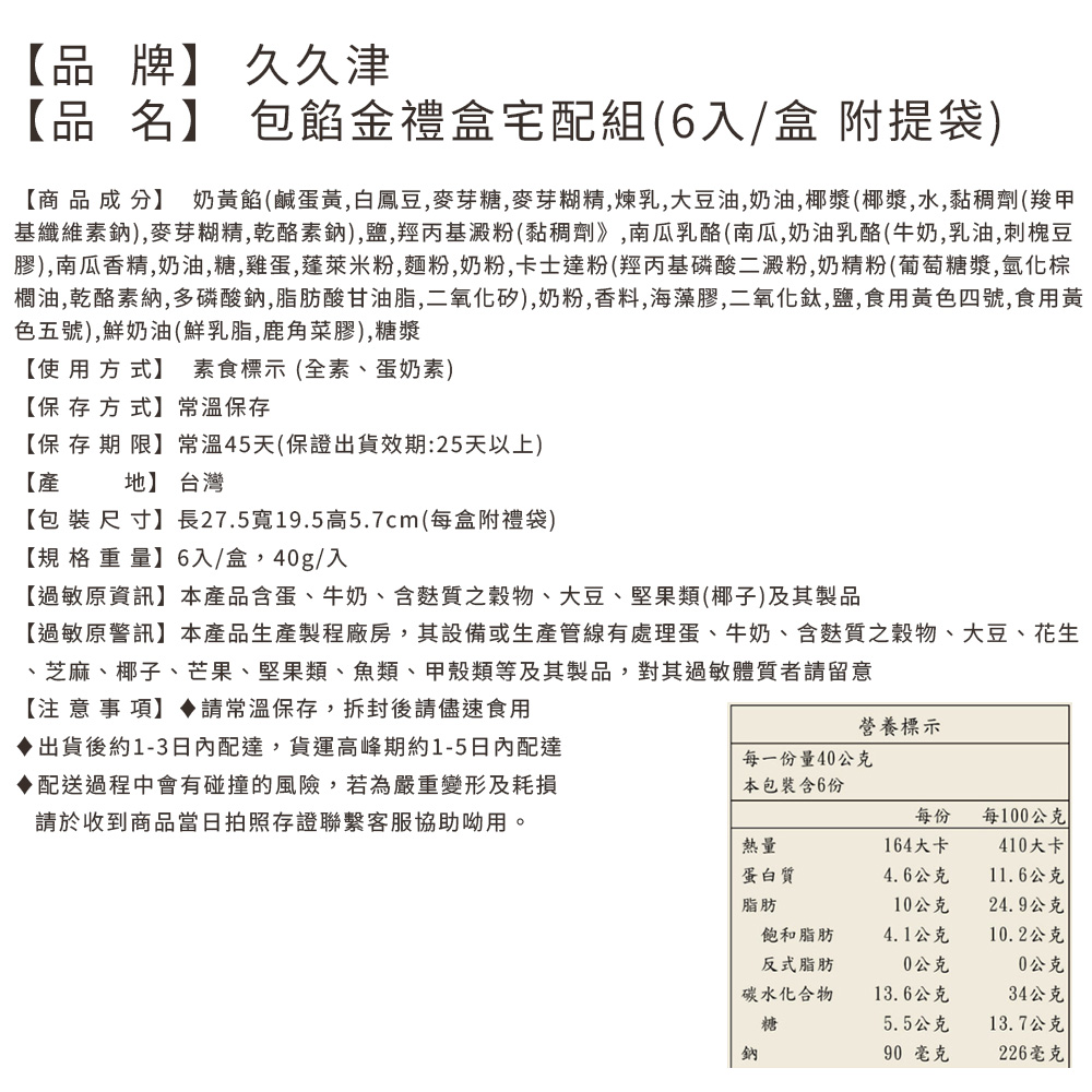| 品名 | 包餡金禮盒(40公克x6入/盒)_2026春節禮盒 |