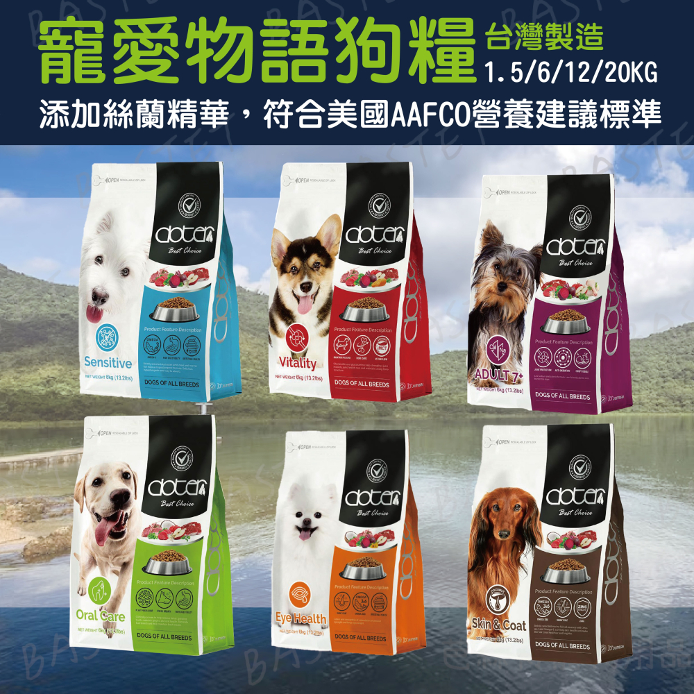 玉米、小麥副產品、澳洲牛肉絨、水解植物蛋白、澳洲羊肉絨、全脂豆粉、天然酵母粉、冷壓椰子仁粉、動物油脂、深海魚肉絨、深海魚油(Omega-3、Omega-6來源)、卵磷脂、水解動物蛋白、苜蓿粉、益生纖維質、氯化膽鹼、綠茶粉、蘋果粉、DL-蛋胺酸、虱目魚精華(HAP .膠原蛋白)、絲蘭萃取物、維生素(A、D、E、K、B1(硫胺素)、B2(核黃素)、B6(吡哆素)、B12(鈷胺素)、葉酸、泛酸、菸鹼酸、生物素)、礦物質(硫酸鋅、硫酸銅、硫酸錳、硫酸鐵、碳酸鈷、碘化鉀)