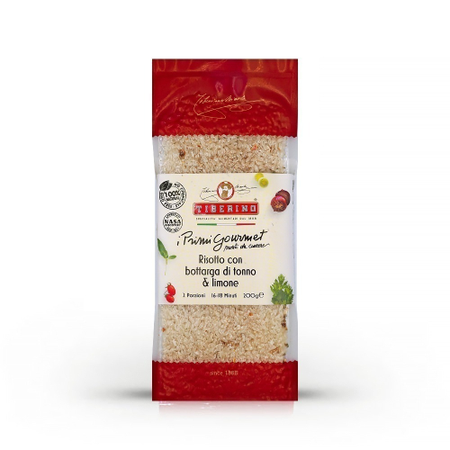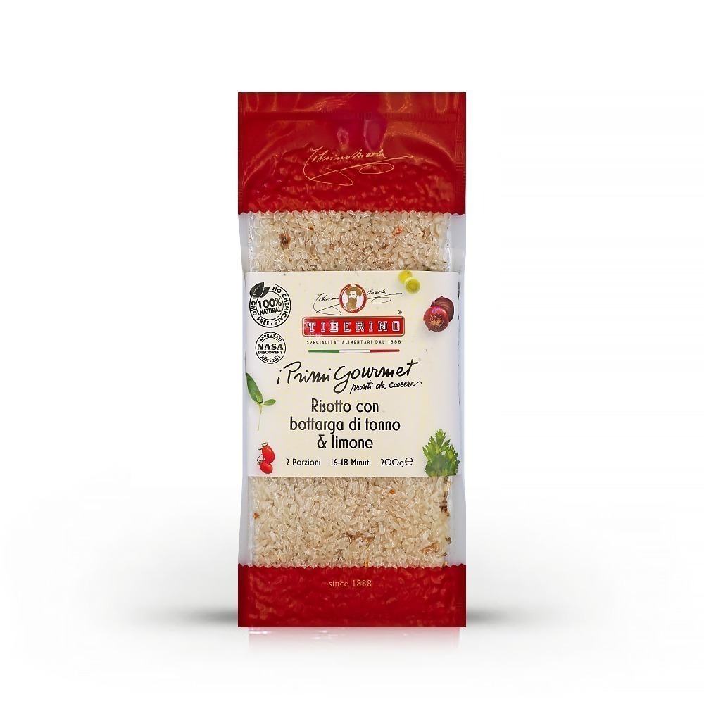 成分:義大利米(Italian rice superfino)、蔬菜高湯[鹽、大豆玉米蛋白萃取物、脫水蔬菜(馬鈴薯、胡蘿蔔、洋蔥、大蒜、洋香菜、芹菜、番茄)、玉米油]、乾燥魚卵(乾燥黃鰭鮪魚卵、海鹽)、檸檬、大蒜、芹菜、胡蘿蔔、洋蔥、洋香菜、特級冷壓初榨橄欖油、黑胡椒