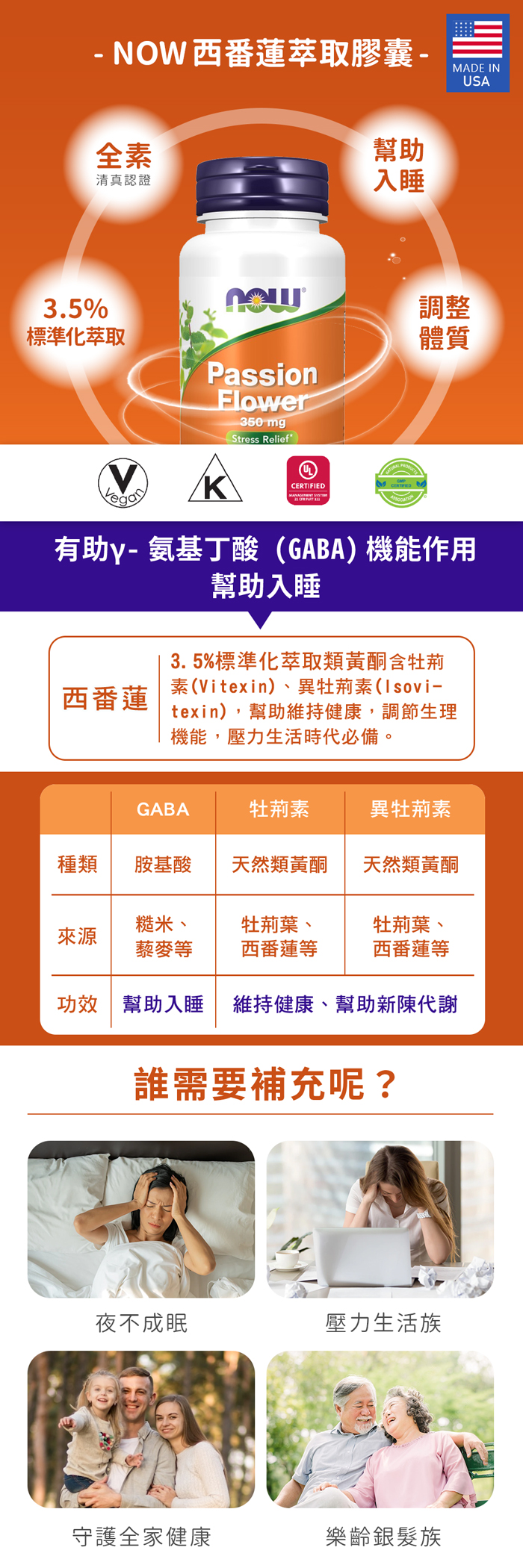 成分:西番蓮萃取物(西番蓮萃取物、麥芽糊精、二氧化矽)、羥丙基甲基纖維素、微結晶狀α-纖維素、硬脂酸、二氧化矽