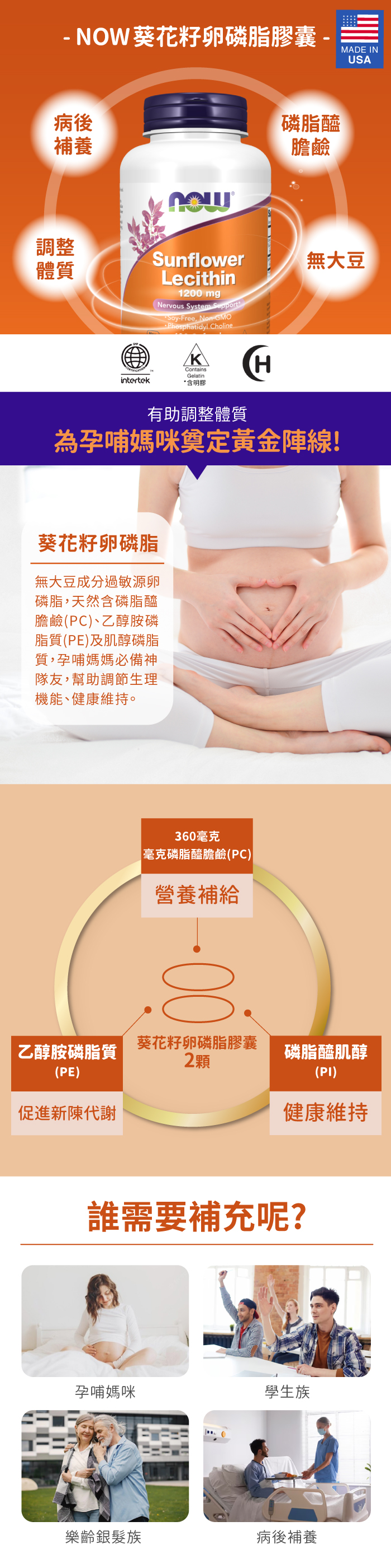 營養成份:熱量18大卡、蛋白質0公克、脂肪2公克 (飽和脂肪0公克、反式脂肪0公克)、碳水化合物0公克(糖0公克)、鈉0毫克、每份葵花籽卵磷脂2400毫克