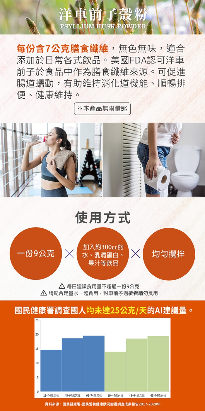 建議用法:取一份(約9克)加入至少300cc冷水或果汁等喜愛的飲品中攪拌均勻後飲用