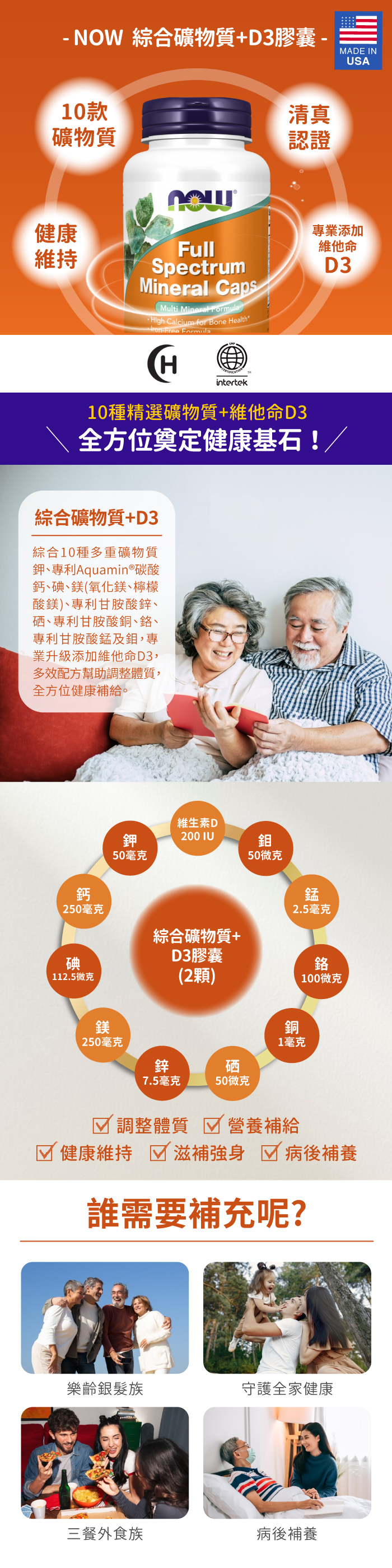 營養成份:維生素D 5微克(200IU)、鉀50毫克、鈣250毫克、碘112.5微克、鎂250毫克、鋅7.5毫克、硒50微克、銅1毫克、鉻100微克、錳2.5毫克、鉬50微克