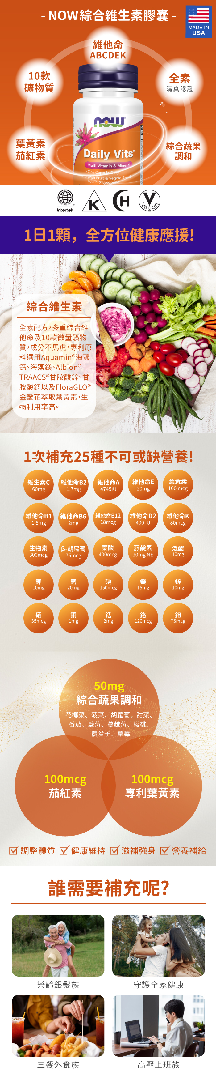 成分:羥丙基甲基纖維素、微結晶狀α-纖維素、碳酸鈣、維生素C、甘胺酸鋅、綜合蔬果調和(花椰菜、菠菜、胡蘿蔔、甜菜、番茄、藍莓、蔓越莓、櫻桃、覆盆子、草莓)、維生素E、菸鹼醯胺、氧化鎂、維生素A(大豆油、維生素A棕櫚酸酯)、氯化鉀、本多酸鈣、甘胺酸錳(甘胺酸錳、微結晶狀α-纖維素)、甘胺酸銅(麥芽糊精、甘胺酸銅)、硬脂酸、維生素K1(微結晶狀α-纖維素、維生素K1)、鉬酸鈉、甲硫胺酸硒(微結晶狀α-纖維素、甲硫胺酸硒)、二氧化矽、葉酸(麥芽糊精、葉酸)、維生素D2(大豆油、維生素D2)、維生素B6、維生素B1、維生素B2、碘化鉀(微結晶狀α-纖維素、碘化鉀)、吡啶甲酸鉻、金盞花萃取物(大豆油、金盞花萃取物)、番茄萃取物、β-胡蘿蔔素(大豆油、β-胡蘿蔔素)、生物素