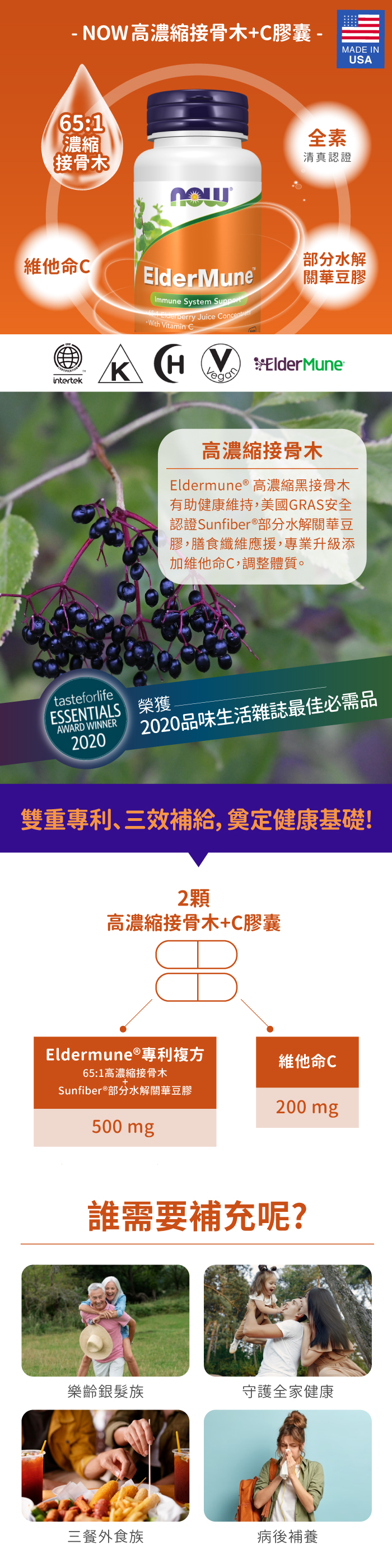 成分:複方接骨木(接骨木、部分水解關華豆膠、二氧化矽)、微結晶狀α-纖維素、維生素C、羥丙基甲基纖維素、硬脂酸、二氧化矽