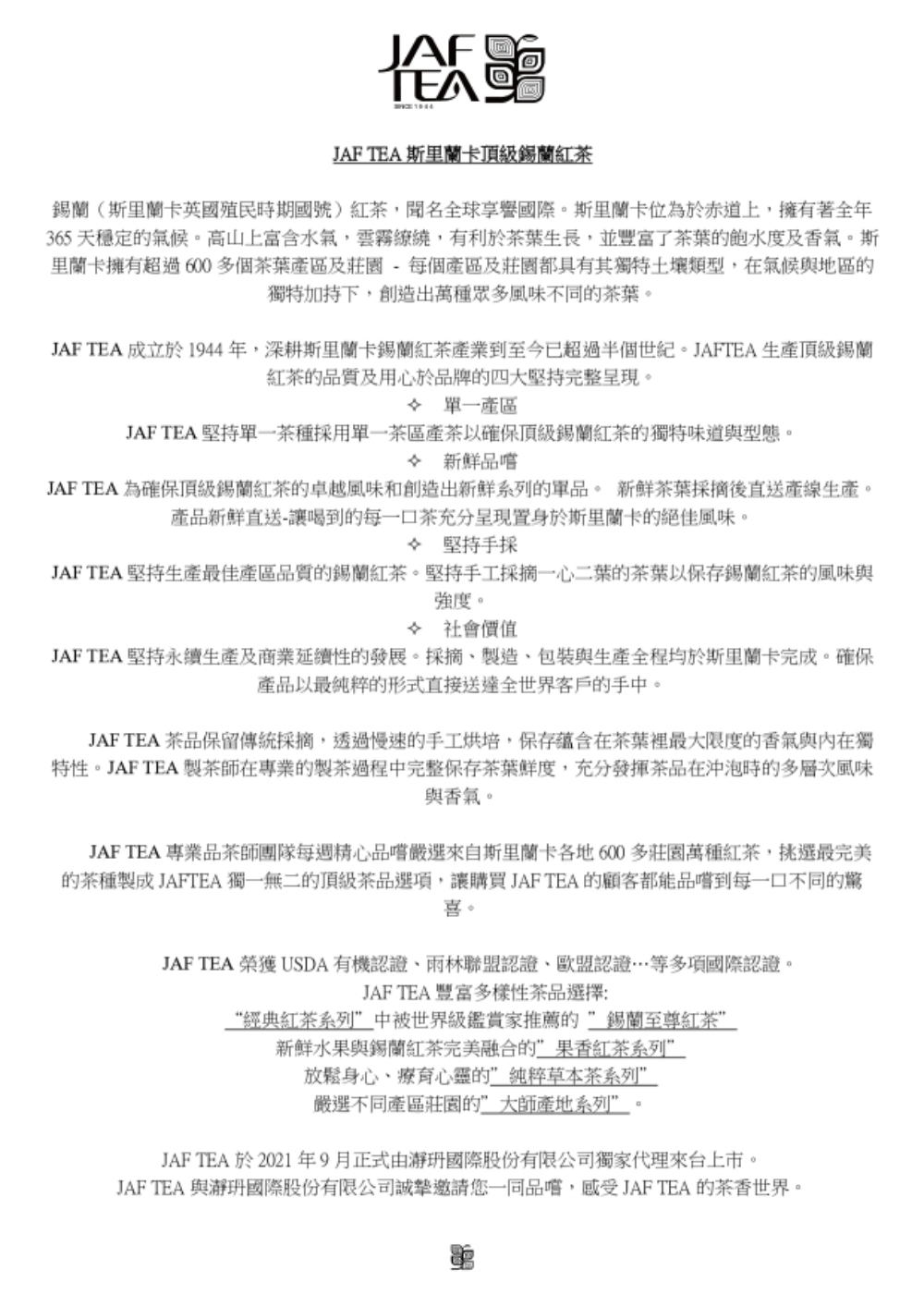 JAF TEA四大堅持