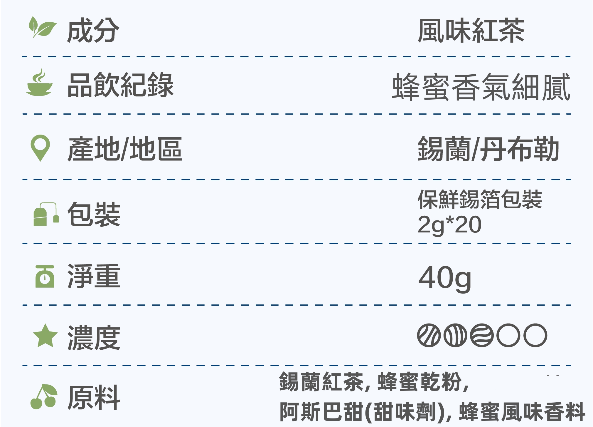 ▎搭配香甜的蜂蜜,香氣細膩、酒體輕盈的紅茶。