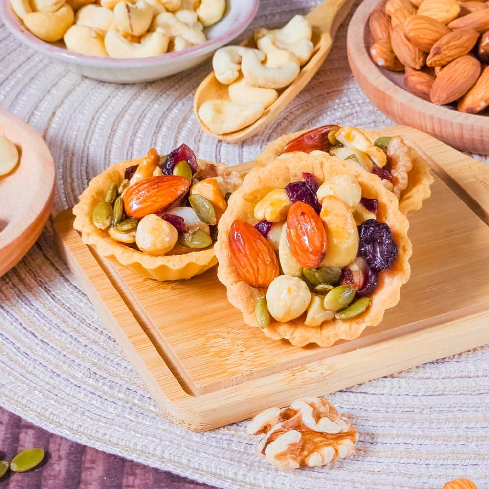 堅果塔,口感酥脆,層次分明,讓你一口接一口的回味無窮。它的成分豐富多樣,有夏威夷果、核桃、杏仁果、腰果、榛果、南瓜子仁、蔓越莓,並且用楓糖點綴,每一口都是不同的驚喜。