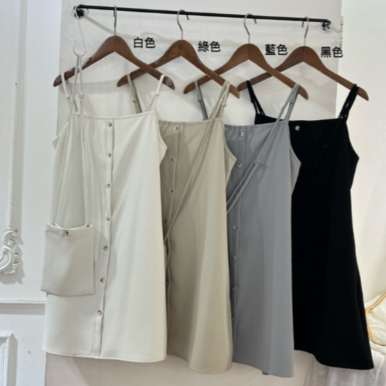 janouseᰔ-素面排釦細肩短洋(附小包) 4 COLORS ! 素面氣質短洋 / 日系洋裝 / 短洋裝