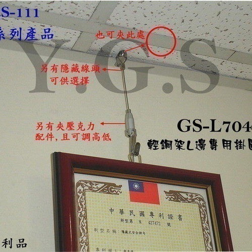 可夾在輕鋼架扁條最旁邊或任一點(掛勾上方壓扣壓著不放可上下調整高低)