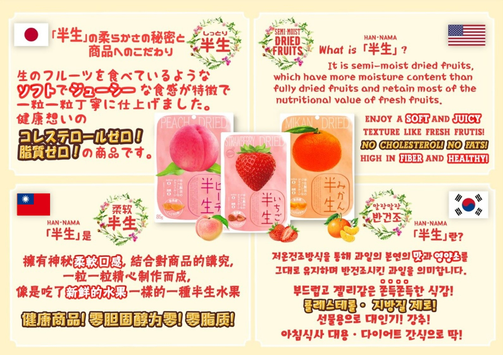 使用新鮮水果製成的半生水果乾,質地濕潤且保留了新鮮水果的美味和香氣。半生果乾是0膽固醇、0脂肪的好吃零嘴。