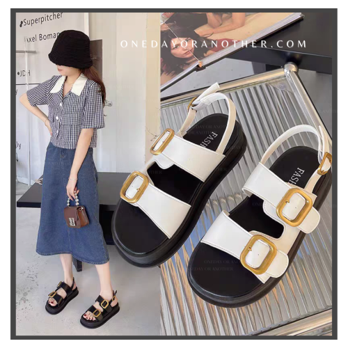 雙釦寬帶休閒厚底涼鞋 金屬釦 羅馬鞋 厚底涼拖鞋 休閒涼鞋 軟底涼鞋 一字扣涼鞋 平底涼鞋 露趾厚底涼鞋 AC996