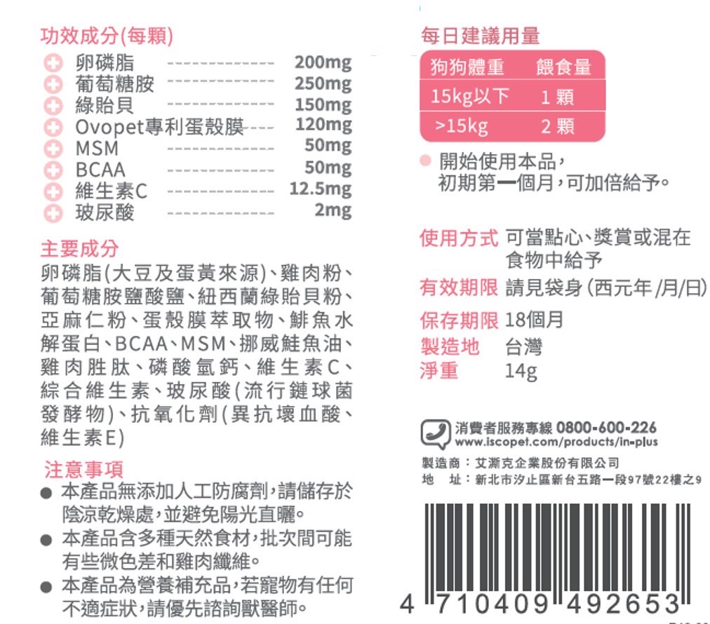【喵爺】IN-PLUS (狗保健品全新升級)全系列 寵物保健品 蛋殼膜卵磷脂 MSM關節保健 狗狗保健品 狗保健品