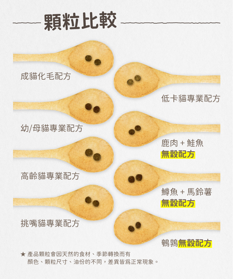新鮮雞肉,新鮮鮭魚,雞肉粉,整粒糙米,微晶纖維素,雞脂(以混合生育醇-天然維生素 E 保鮮),燕麥片,整粒白米,馬鈴薯,大麥,小米,火雞肉,鴨肉,胡蘿蔔,豌豆,蘋果,海帶,蔓越莓粉,迷迭香萃取物,洋香菜薄片,乾菊苣根,牛磺酸,絲蘭提取物,腸道益生菌,亞麻籽,雞蛋,維生素與礦物質。