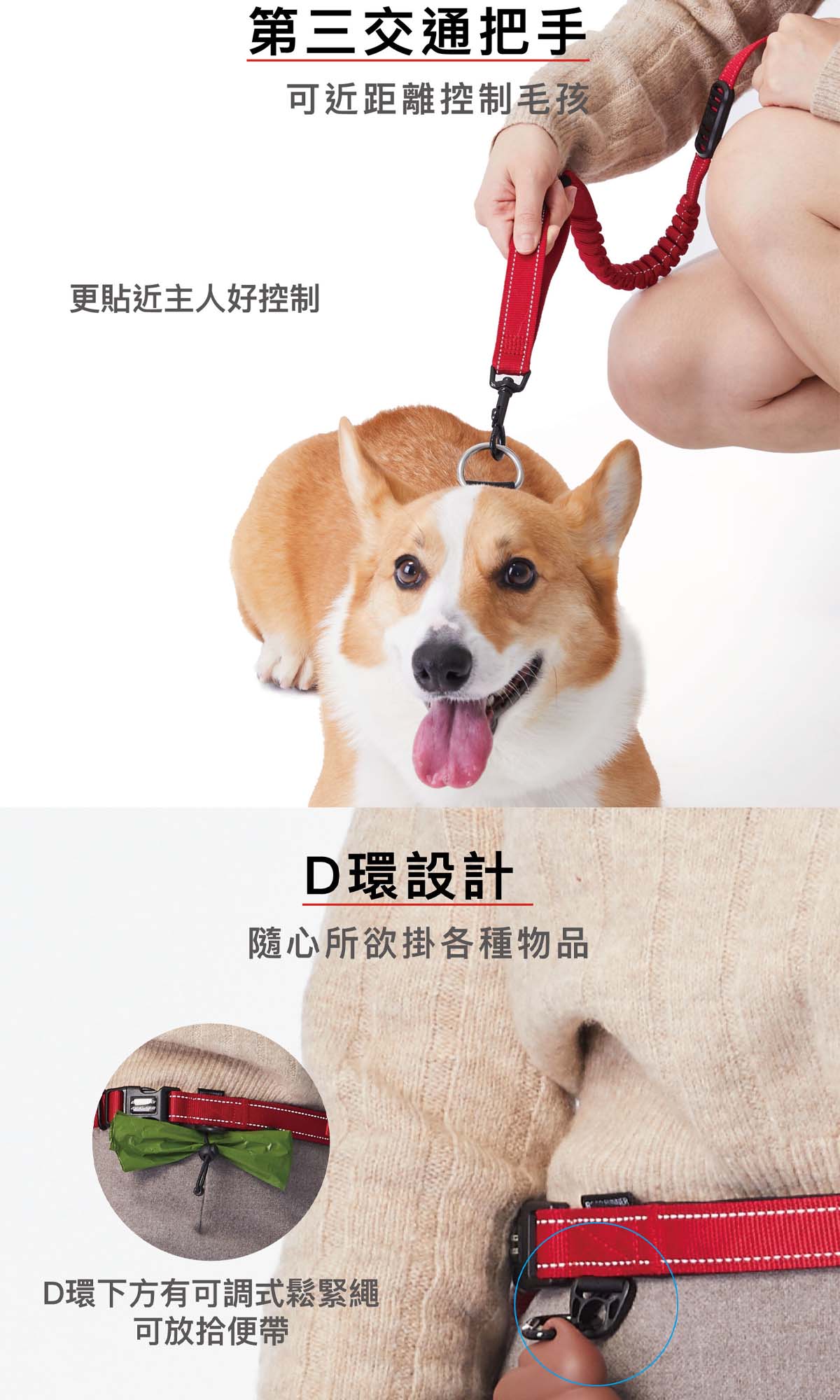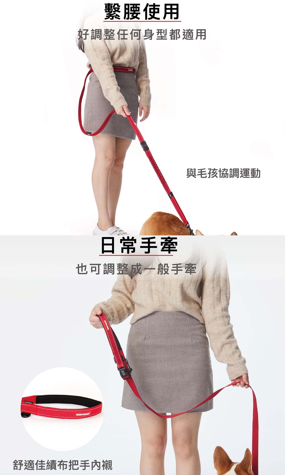 • 使用者可以輕易的調整織帶來適合不同的腰圍尺寸,把牽繩的繫腰部位調到最小還可當臨時手牽繩或長牽綁使用。