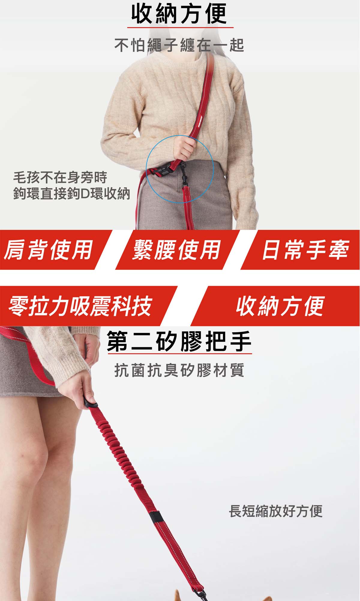• 使用了零拉力科技 – 新一代的吸震墊來減輕主人和愛犬之間的衝擊力。