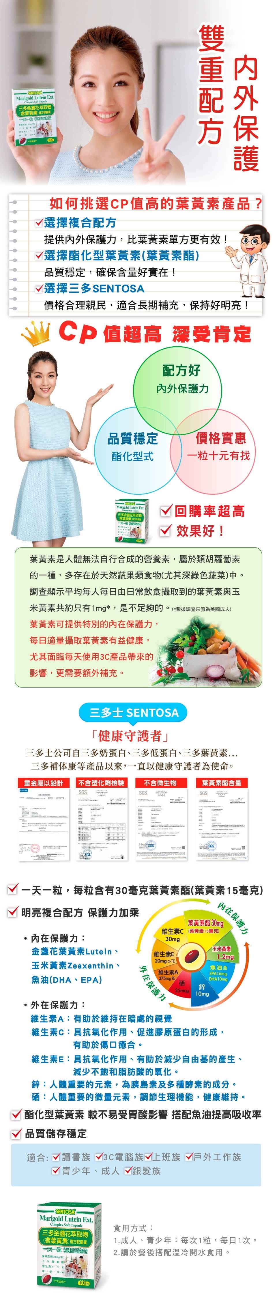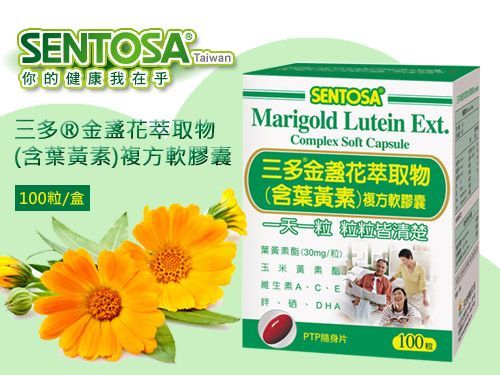 - 每粒含金盞花萃取物150毫克(含葉黃素酯30毫克、玉米黃素)。