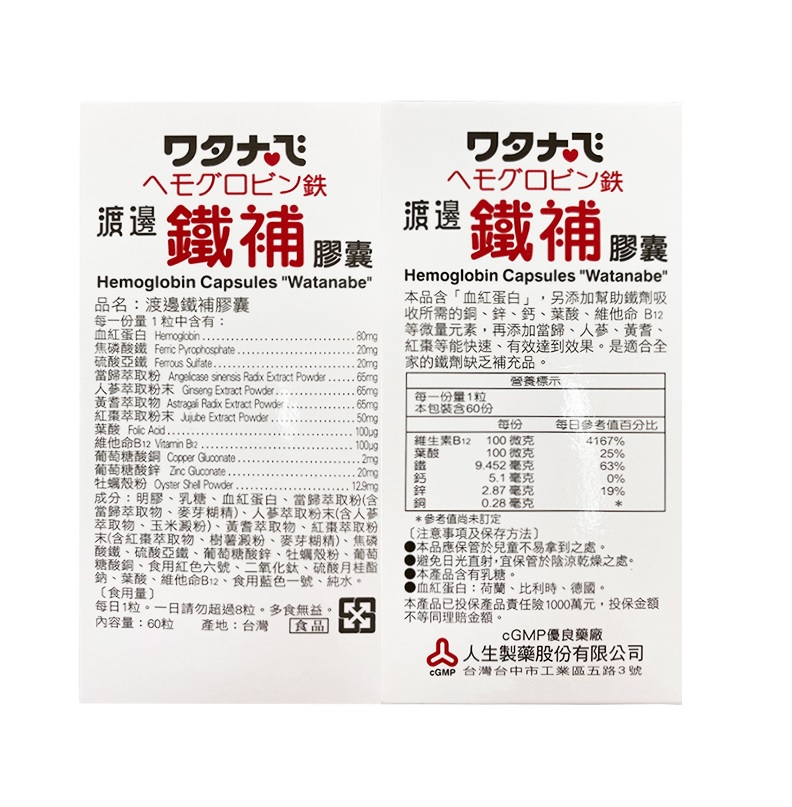 - 成 份:明膠、乳糖、血紅蛋白、當歸萃取粉(含當歸萃取物、麥芽糊精)、人蔘萃取粉末(含人蔘萃取物、玉米澱粉)、黃耆萃取物、紅棗萃取粉末(含紅棗萃取物、樹薯澱粉、麥芽糊精)、焦磷酸鐵、硫酸亞鐵、葡萄糖酸鋅、牡蠣殼粉、葡萄糖酸銅、食用紅色六號、二氧化鈦、硫酸月桂酯鈉、葉酸、維他命B12、食用藍色一號、純水。