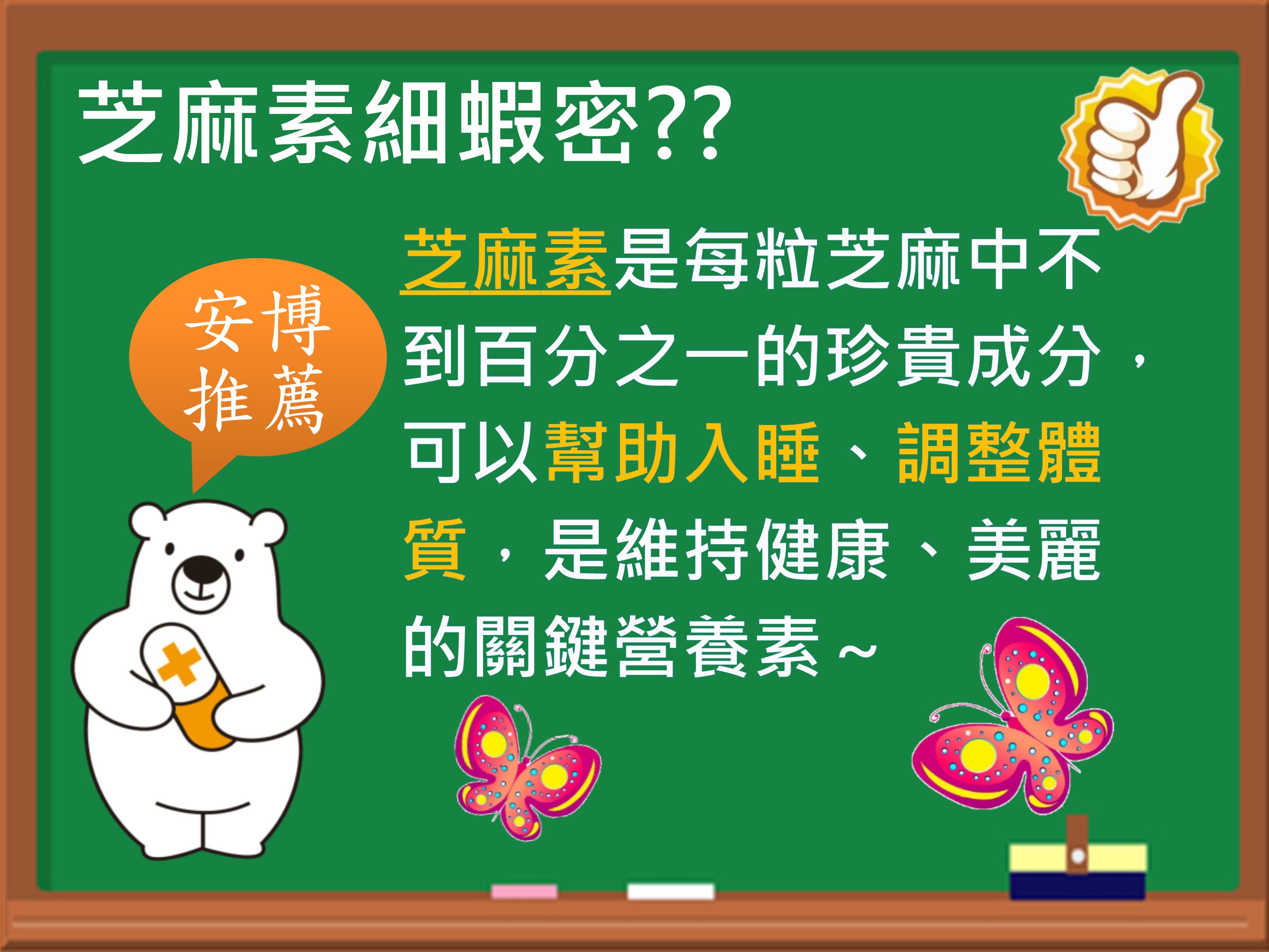 2. 芝麻素是每粒芝麻中含量不到百分之一的稀有珍貴成分,配加GABA可以幫助入睡、調整體質,是維持健康、美麗的關鍵營養素,可說是青春活力的保養聖品。
