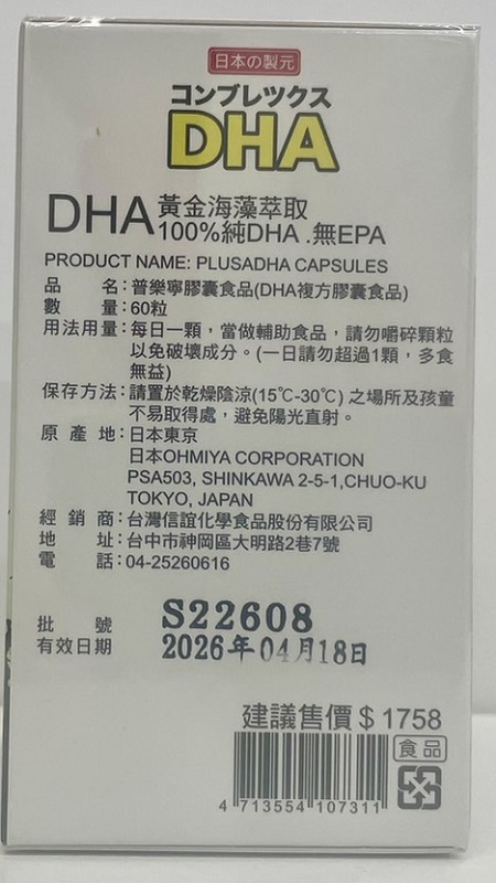 日本進口 普樂寧膠囊 黃金海藻萃取100% DHA 60粒/盒