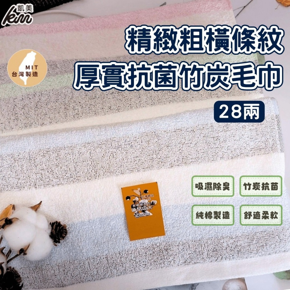👍凱美棉業| MIT台灣製 精緻粗橫條紋28兩厚實抗菌竹炭毛巾