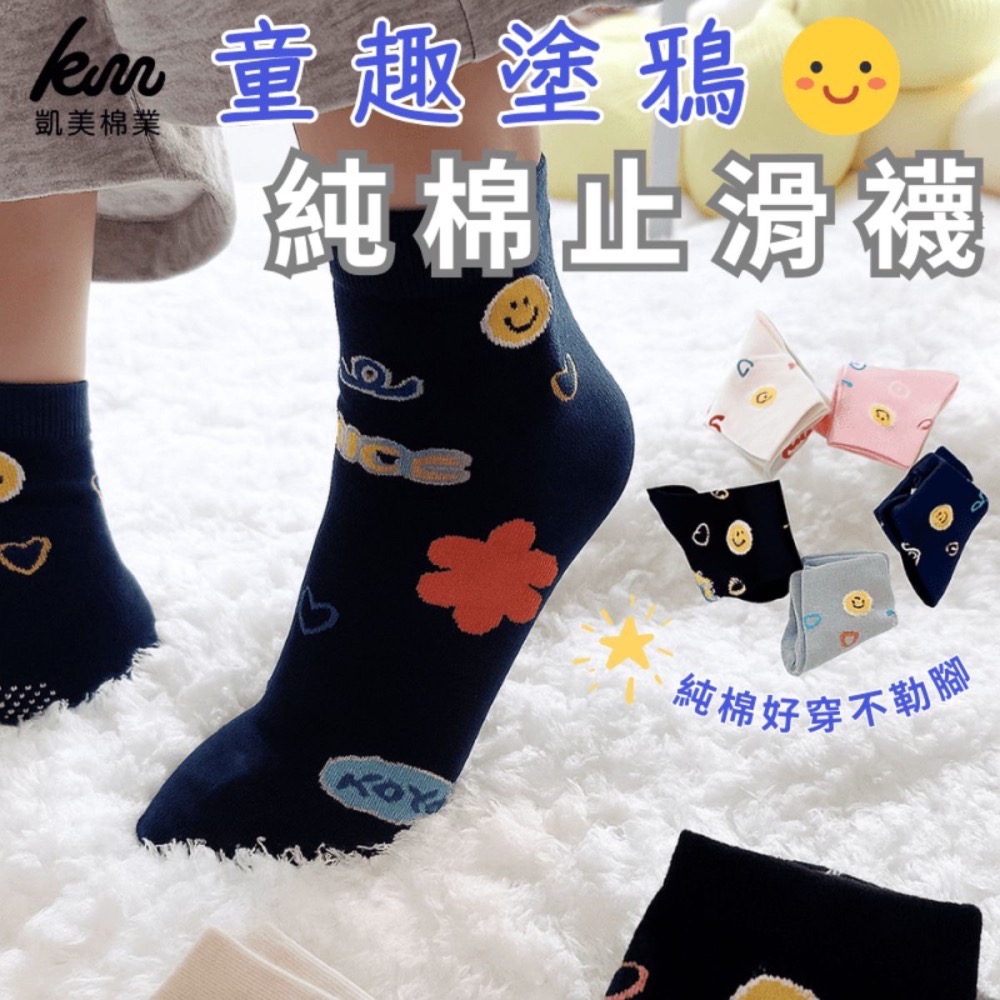 【童趣塗鴉純棉止滑襪 】MIT台灣製造 22-26cm 凱美棉業 ✨嚴選頂級棉質,親膚柔軟超透氣! 🌈繽紛塗鴉設計搭配時尚撞色,童趣感十足~ 🧦彈性襪口不勒腳踝,久穿也舒適~ ⛑️腳底防滑膠點設計,跑跳玩耍不脫落! 👶22-26cm合腳版型,守護寶貝每一步~ 🎁台灣精工製造,送禮自用都超適合! 【商品規格】 材質:棉80% 彈性纖維15% 尼龍2% 橡膠3% 尺寸:22-26cm 顏色:淺灰 /米白/ 丈藍/黑色/粉色 產地:台灣 【襪子購買注意事項】 1. 襪子具有彈性,隨著每批色紗與用料不同,襪子會有±1~2公分的彈性範圍,在紡織品上屬於正常範圍。 2. 挑選襪子尺寸的方式,可參考【自己平日的襪子尺寸】做依據。 3. 我們會盡最大努力滿足大眾需求,但每位消費者腳型的寬窄版型都不同,因此實際感受與效果也會不一樣。