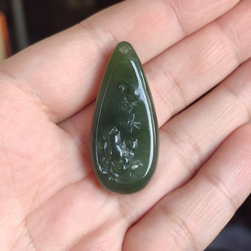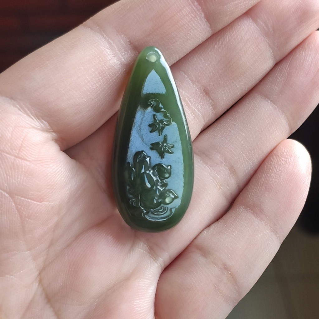 【賞】和田玉 青海料 湖水綠 浮雕 荷花蜻蜓 吊墜