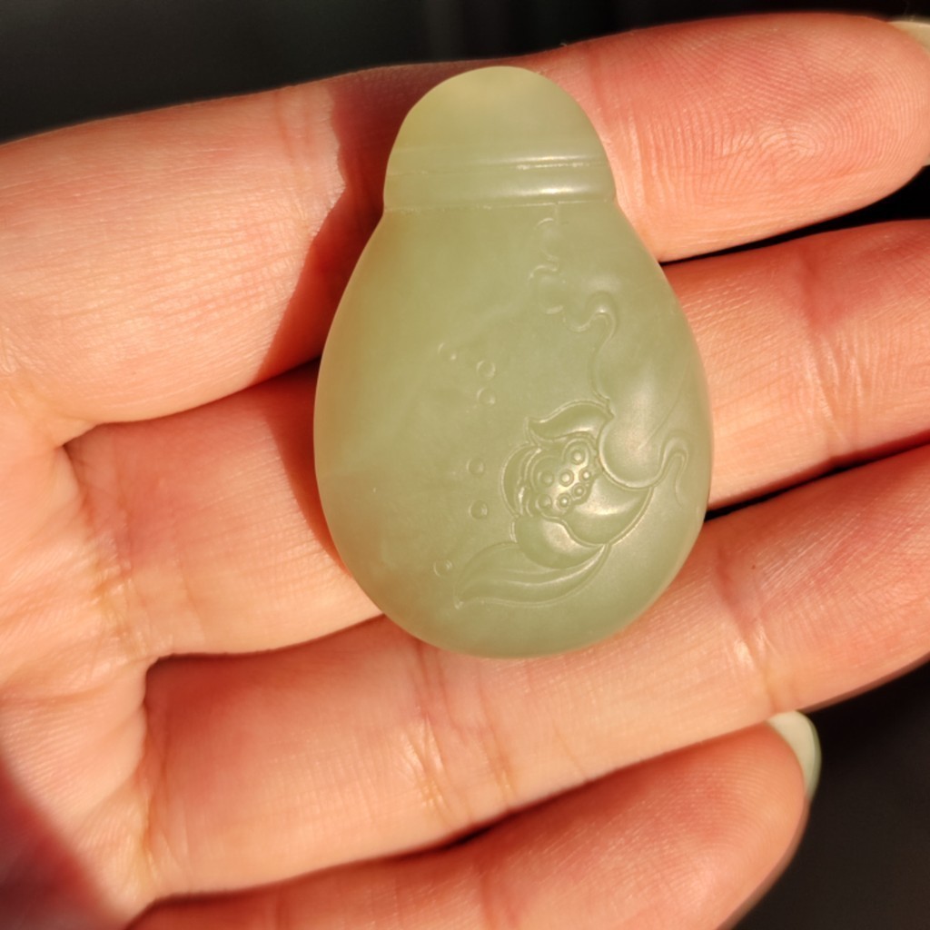 【掛墜擺件】和田玉 青海料 湖水綠 晴水色 荷花圖 雕件 寶瓶 小手把 吊飾 包掛