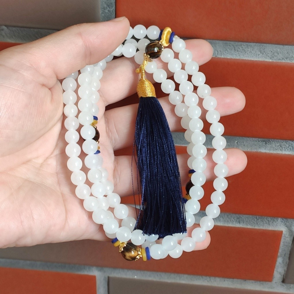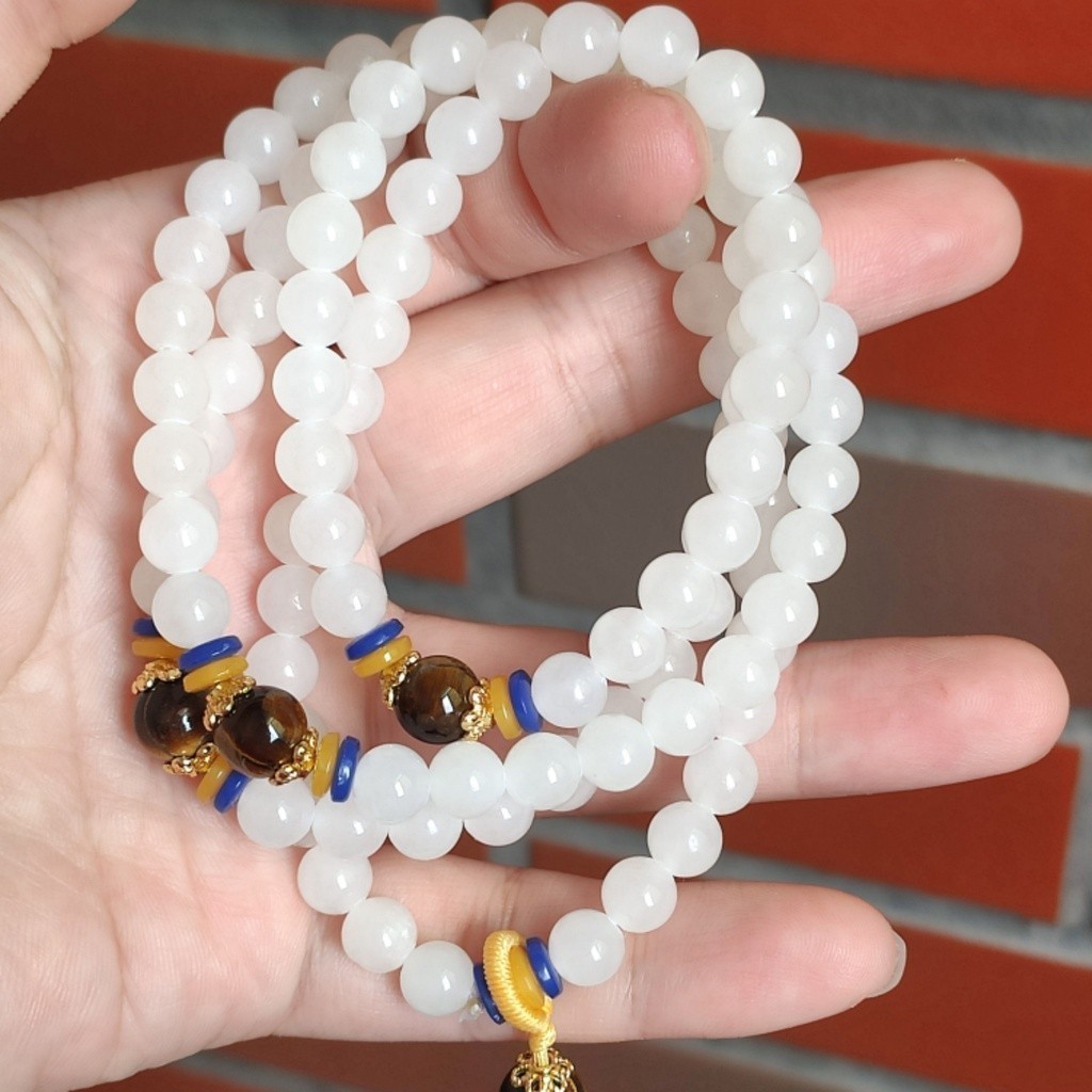 【珠串】和田玉 青海料 白色 108顆 圓珠 長串 手持 項鍊 手持 佛珠 念珠 手串