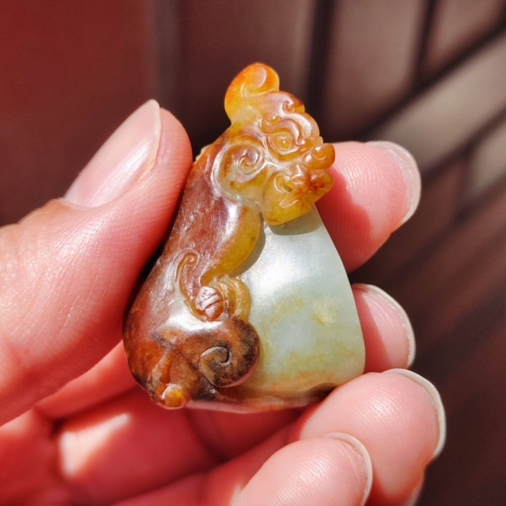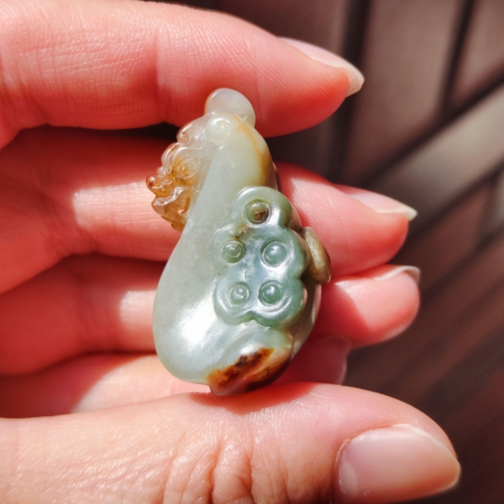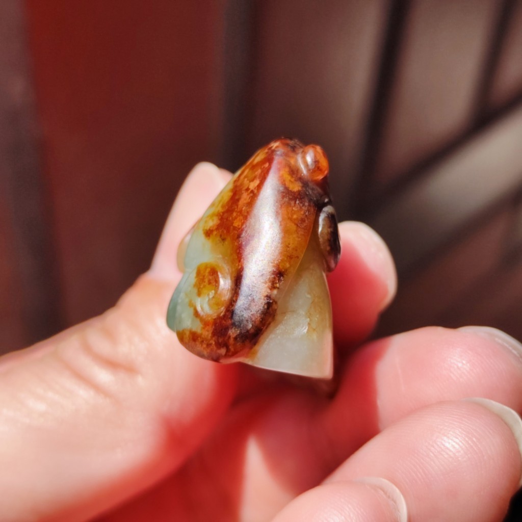 【賞】籽料 紅皮青白肉帶翠 三色蓮蓬貔貅 手工雕